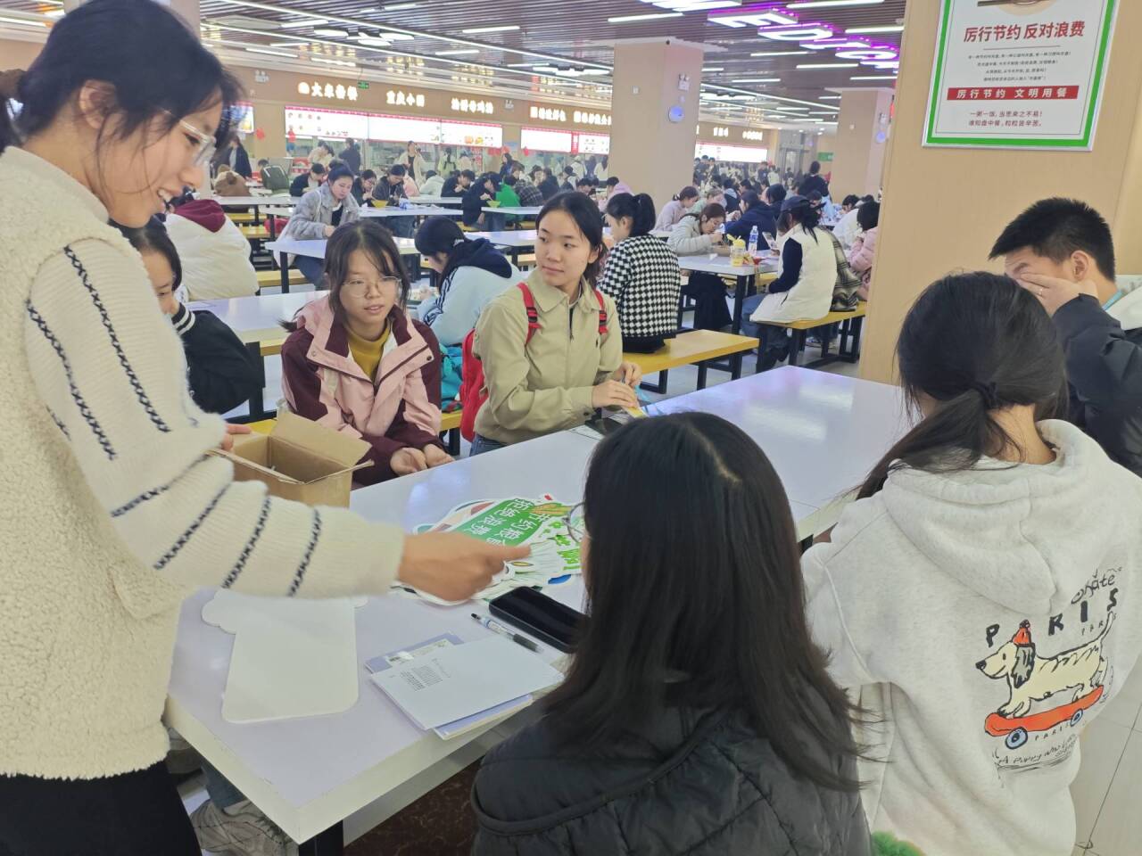 以前总怕不够吃会多打菜,现在看到有志愿者鼓励光盘,还能拿到小礼物,就会特意根据自己的食量点餐。”刚收到钥匙扣的同学们笑着说。据统计,活动期间食堂的厨余垃圾量较往日减少很多,主动要求“少打一点”的同学数量明显增多,“吃多少、打多少”逐渐成为校园用餐新习惯。
