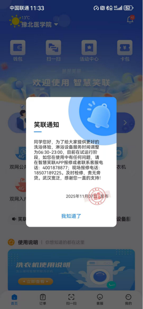 淋浴时长优化:平原校区所有宿舍的热水淋浴时间已调整为6:30—23:00并启动试运营,后勤团队将持续收集大家的使用反馈,及时优化调整以适配更多需求。